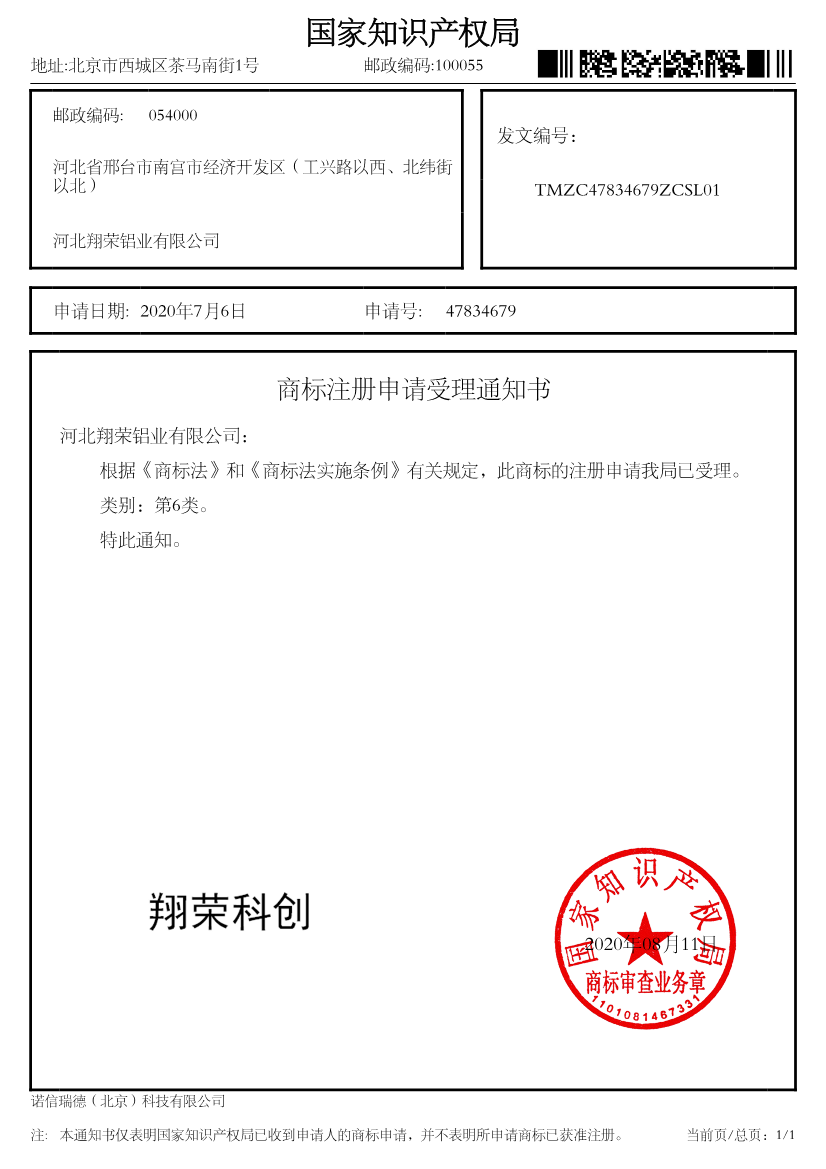 【概要描述】河北翔榮鋁業(yè)有限公司知識產(chǎn)權受理證書